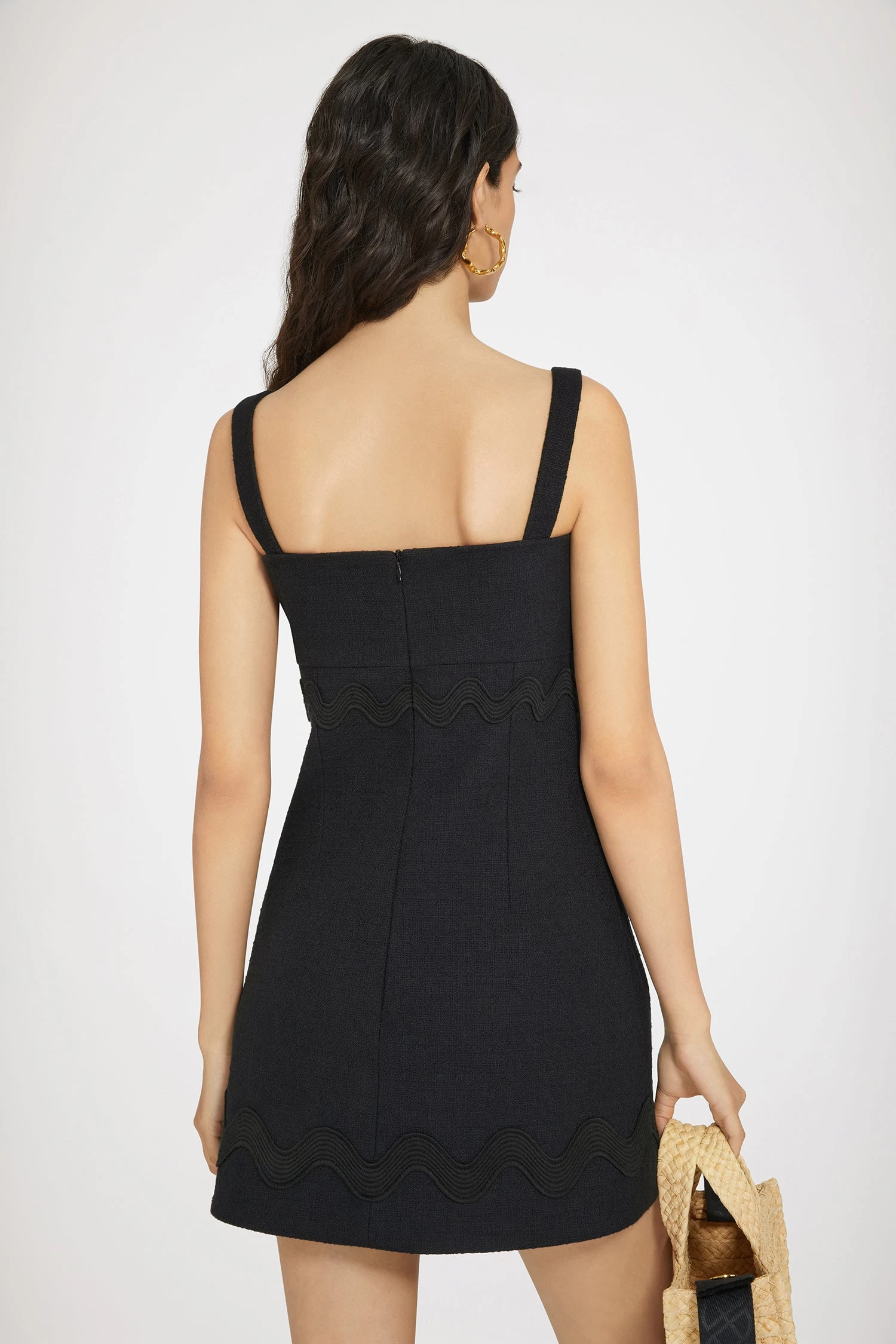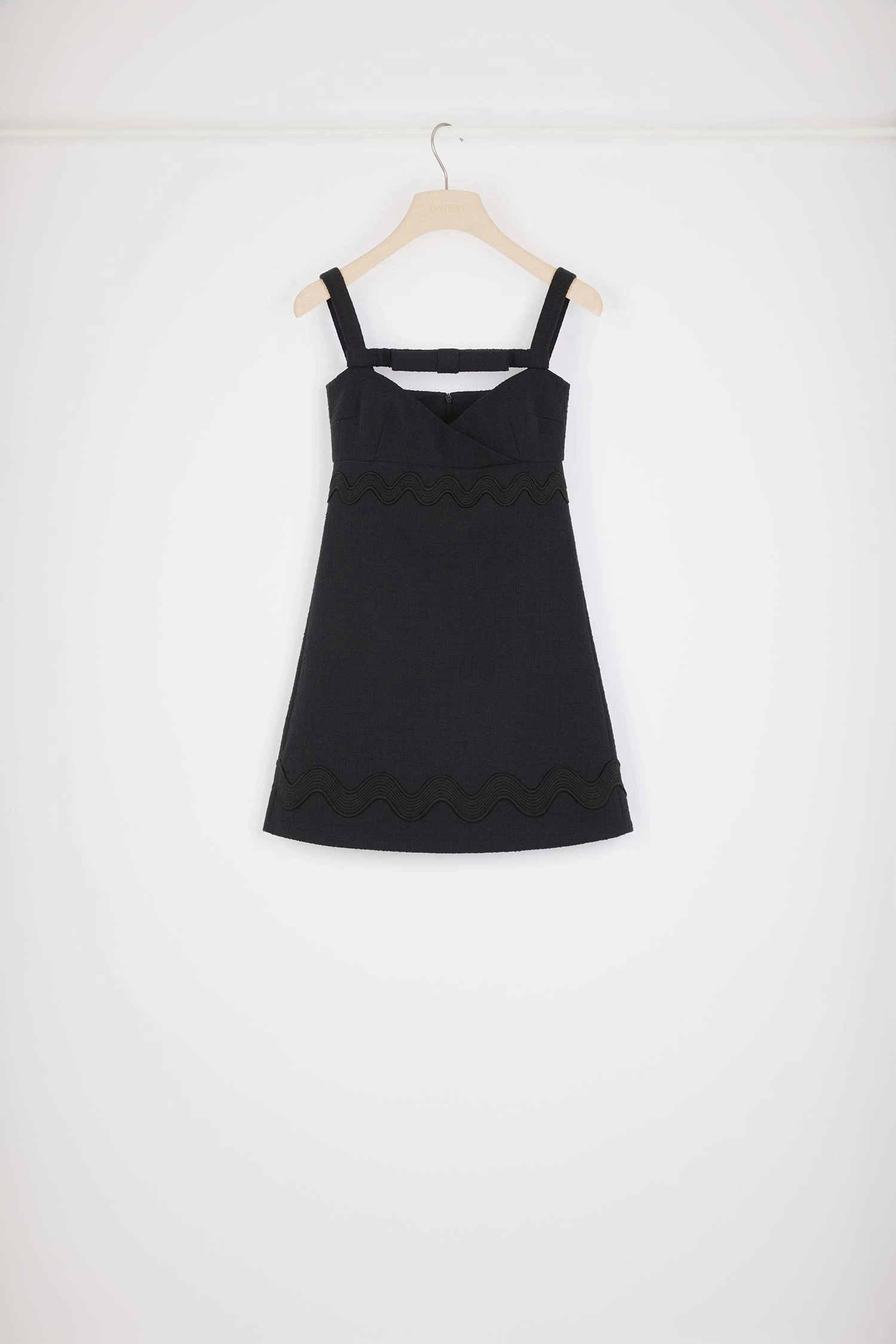 Black cotton tweed dress. Short length. Architectural sweetheart neckline with bow-adorned strap. Wide straps. Rear zip fastening. Tonal wave trims.