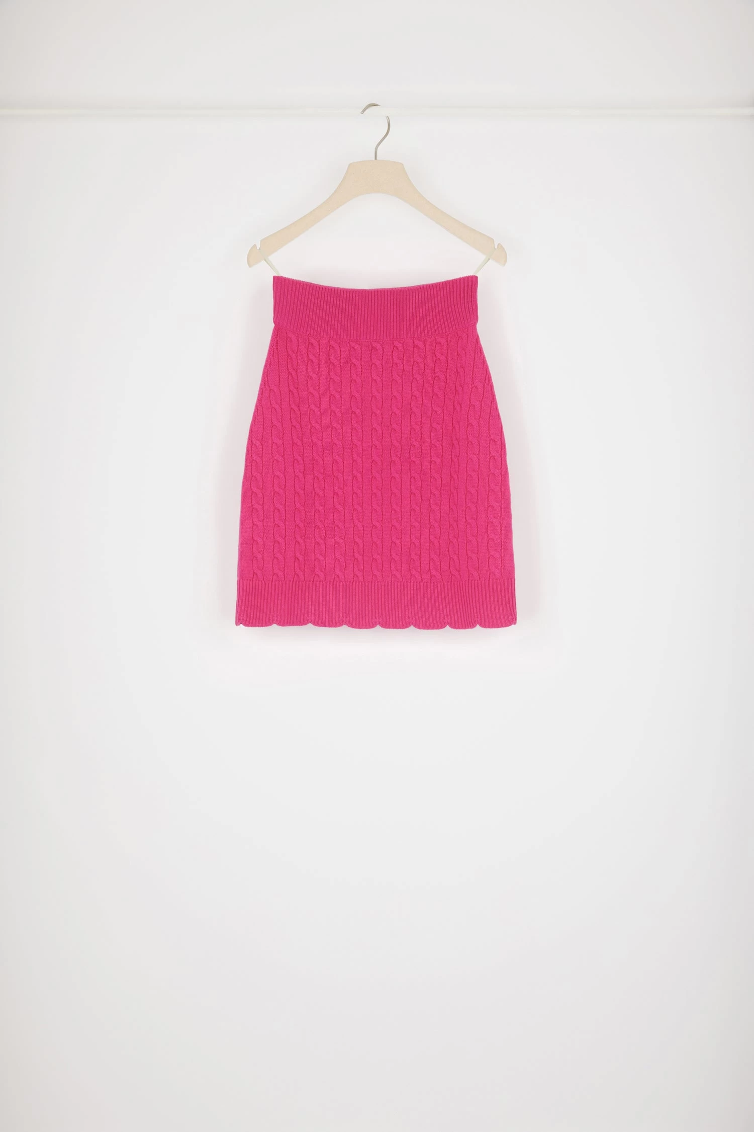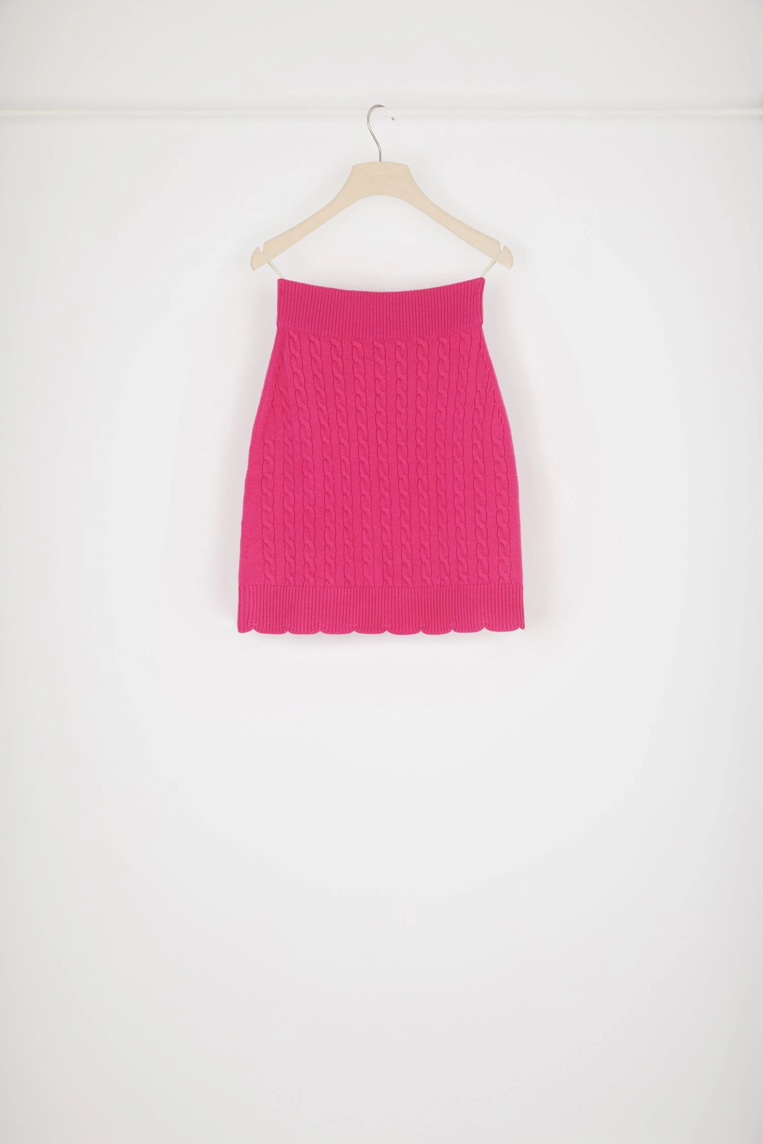 Fuchsia Merino wool skirt. Cable knit. Fitted silhouette. High waist. Scalloped hem.