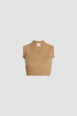 Biscuit beige sustainable wool and cashmere jumper. Cropped length. V neck. Ribbed collar, cuffs and hem. Sleeveless.