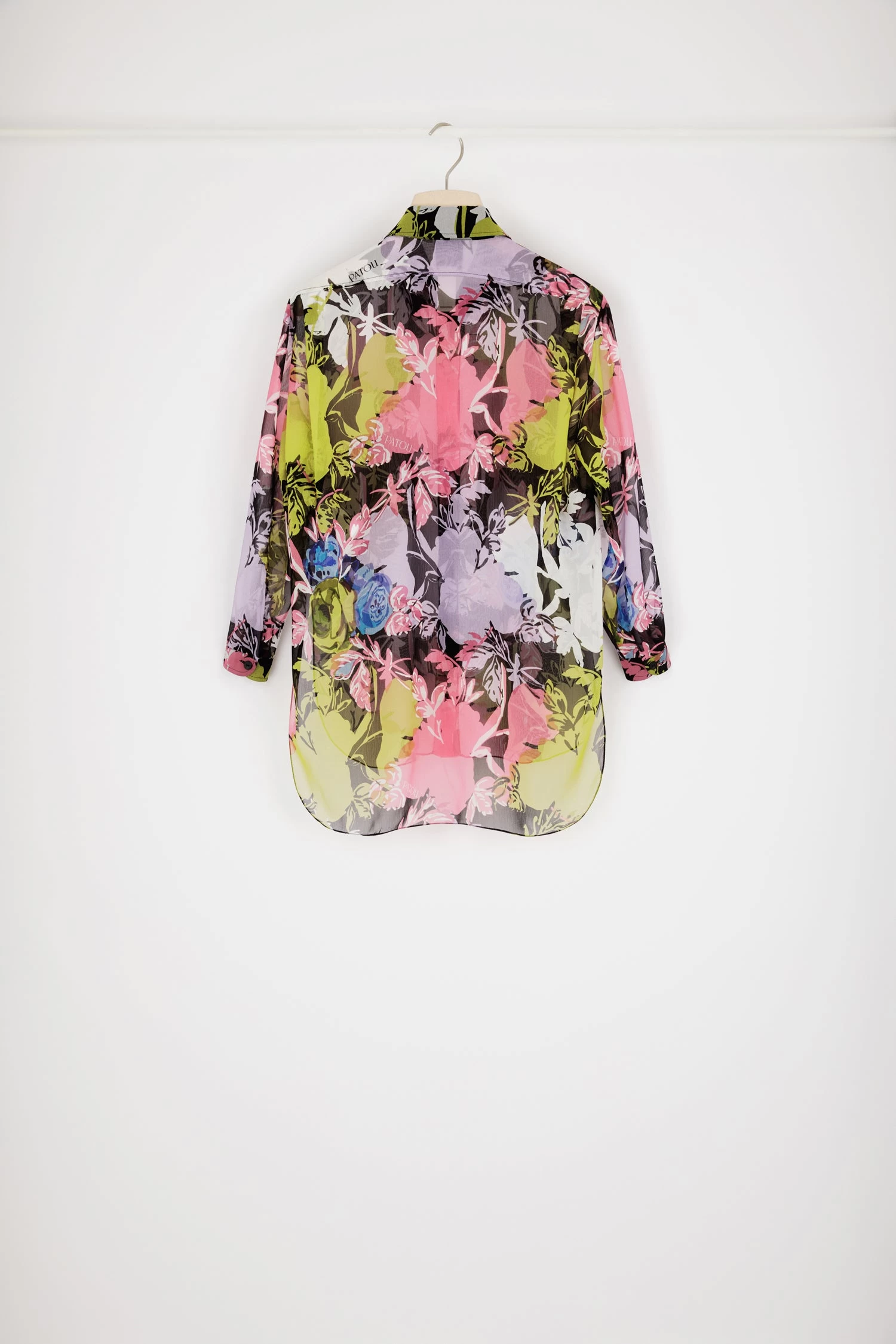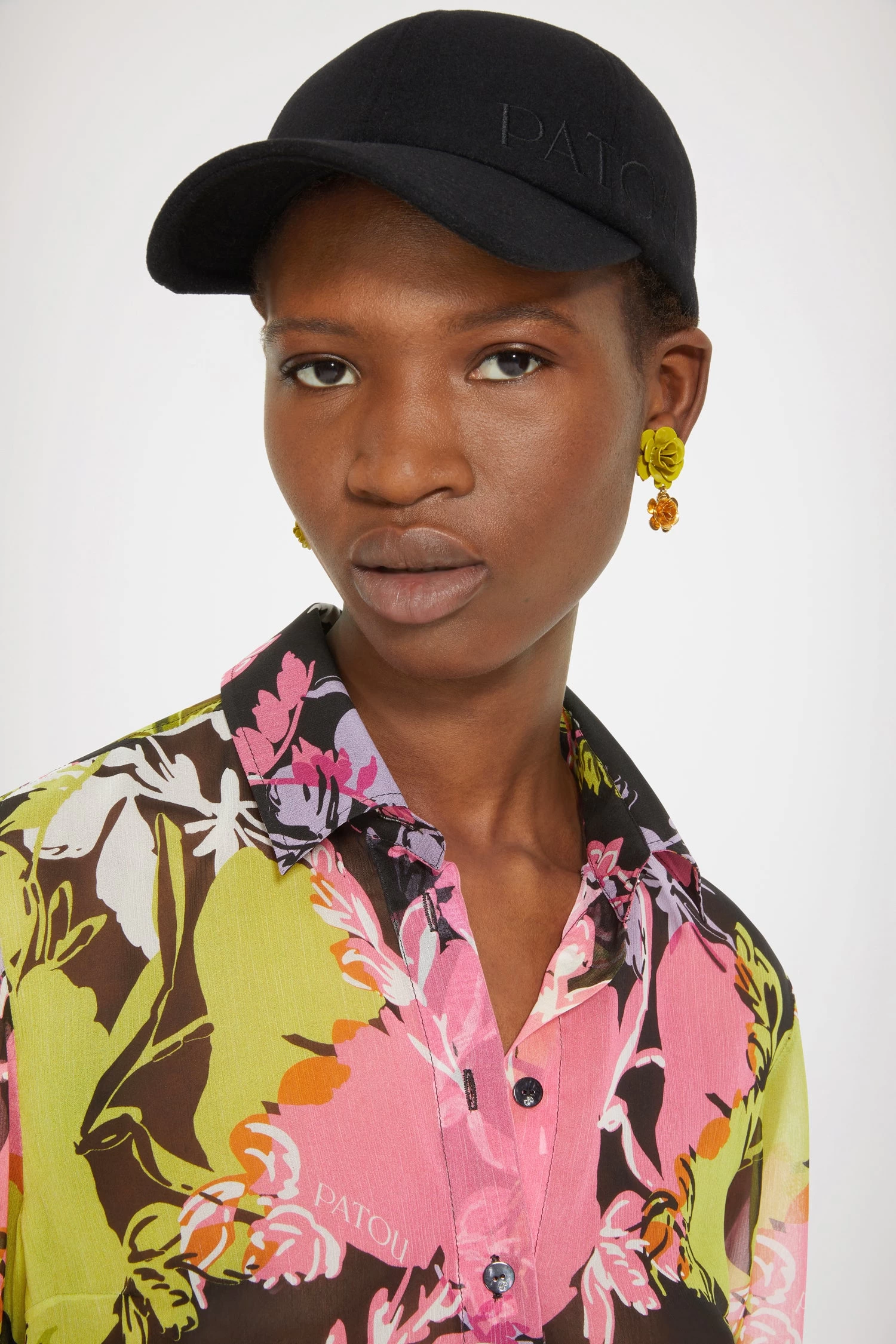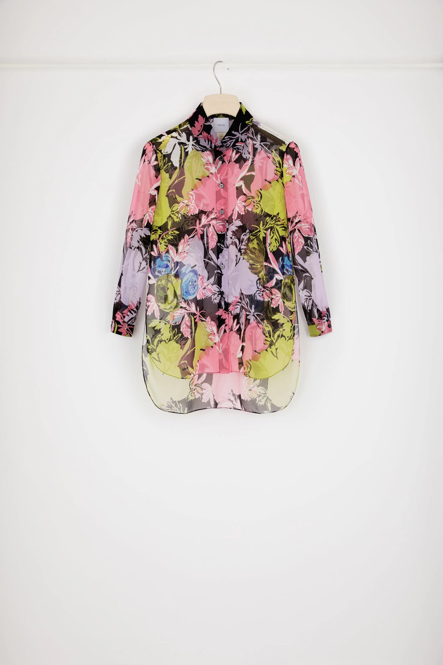 Floral silk muslin shirt featuring the seasonal « Absinthe Garden » print. Patou logo all over. Peter Pan collar. Button fastening. Slightly cropped sleeves. Buttoned cuffs. Split sides. Curved hem.