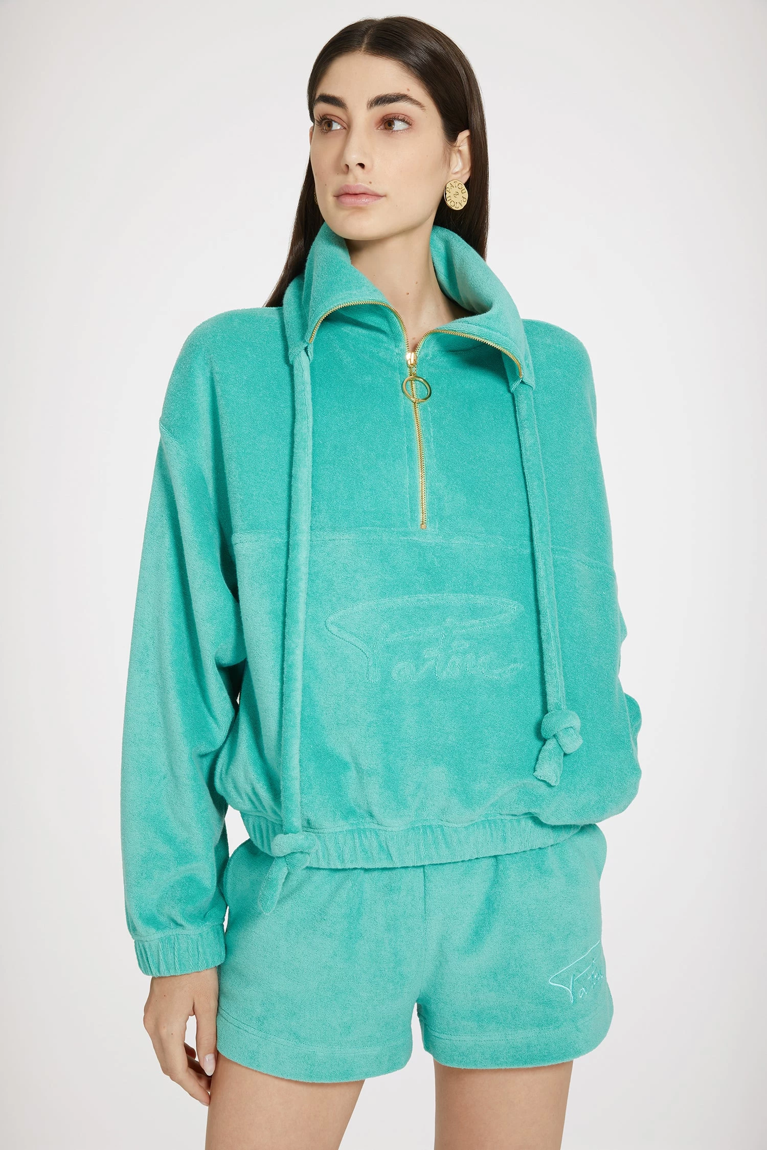 Mint green organic cotton terry sweatshirt. Relaxed silhouette. Wide collar with gold-tone zip. Thick self-fabric drawstring. 3D handwritten Jean Patou’s signature at the front. Elasticated cuffs and waist.
