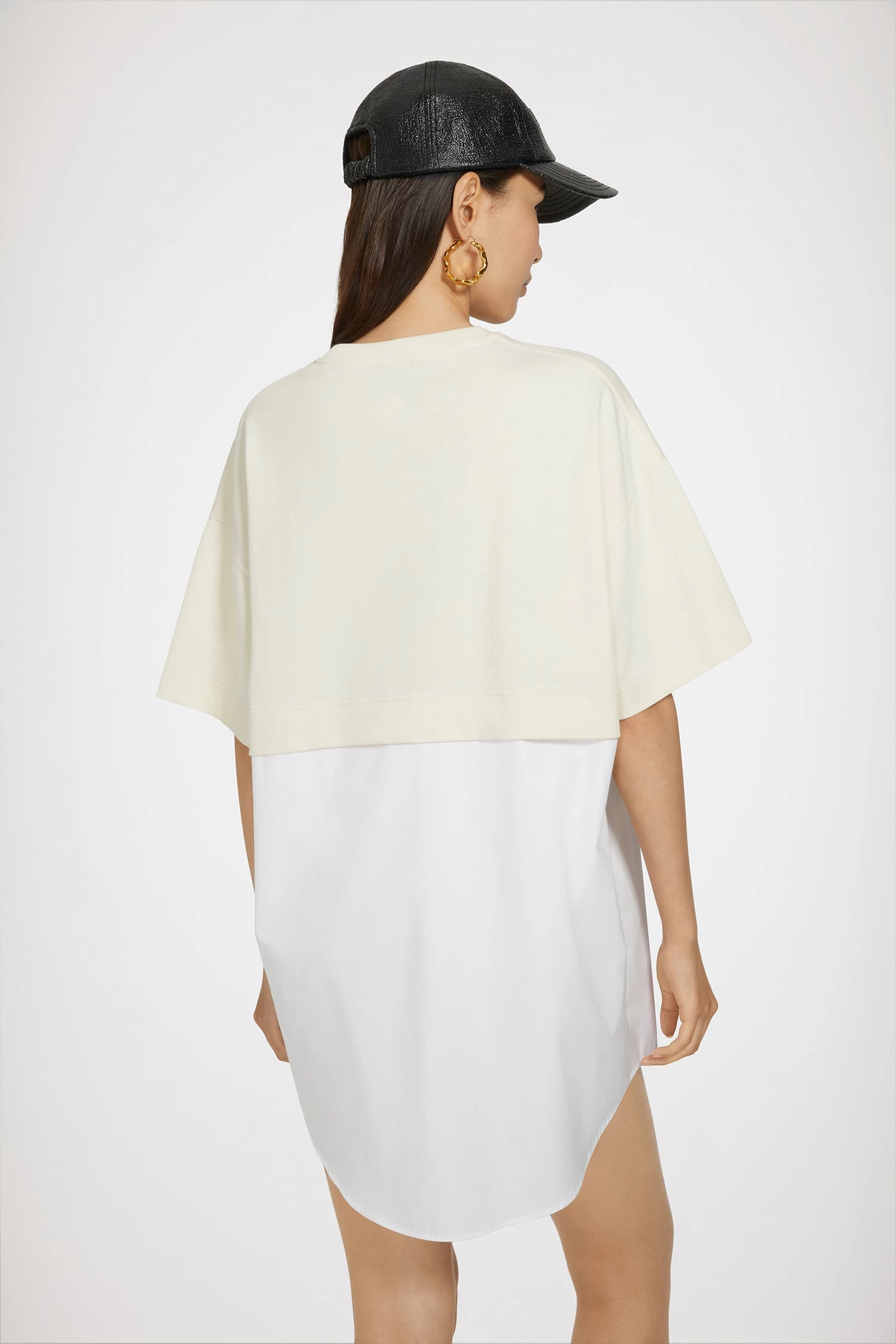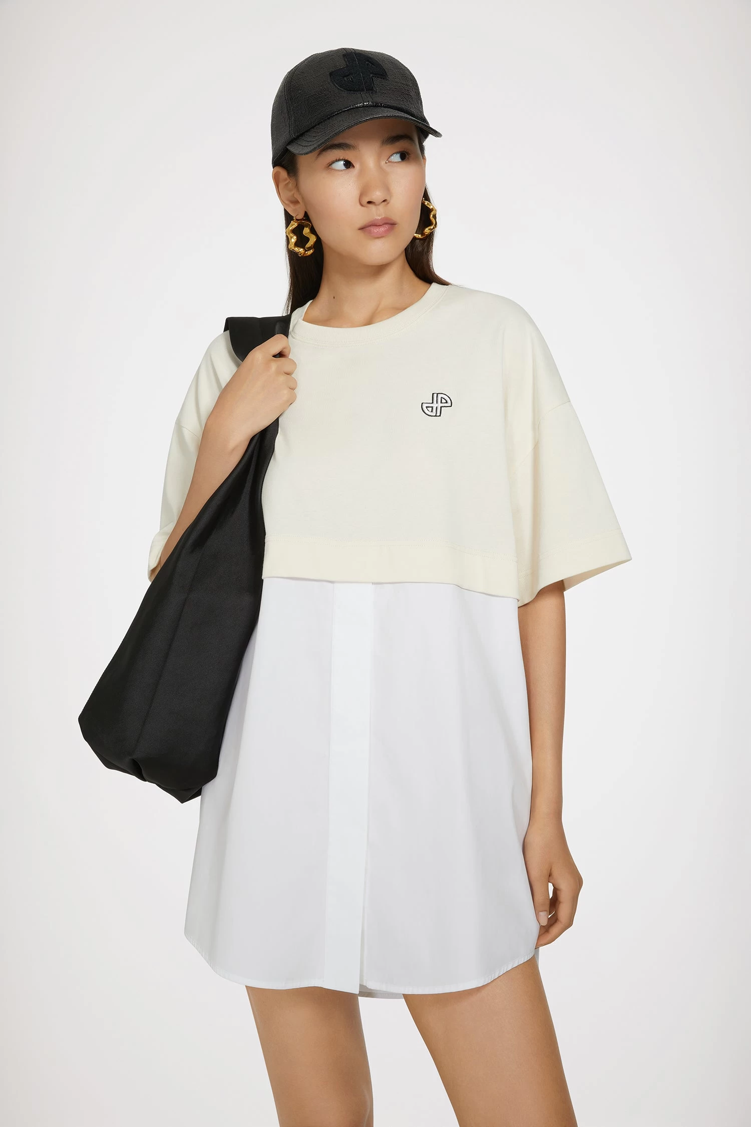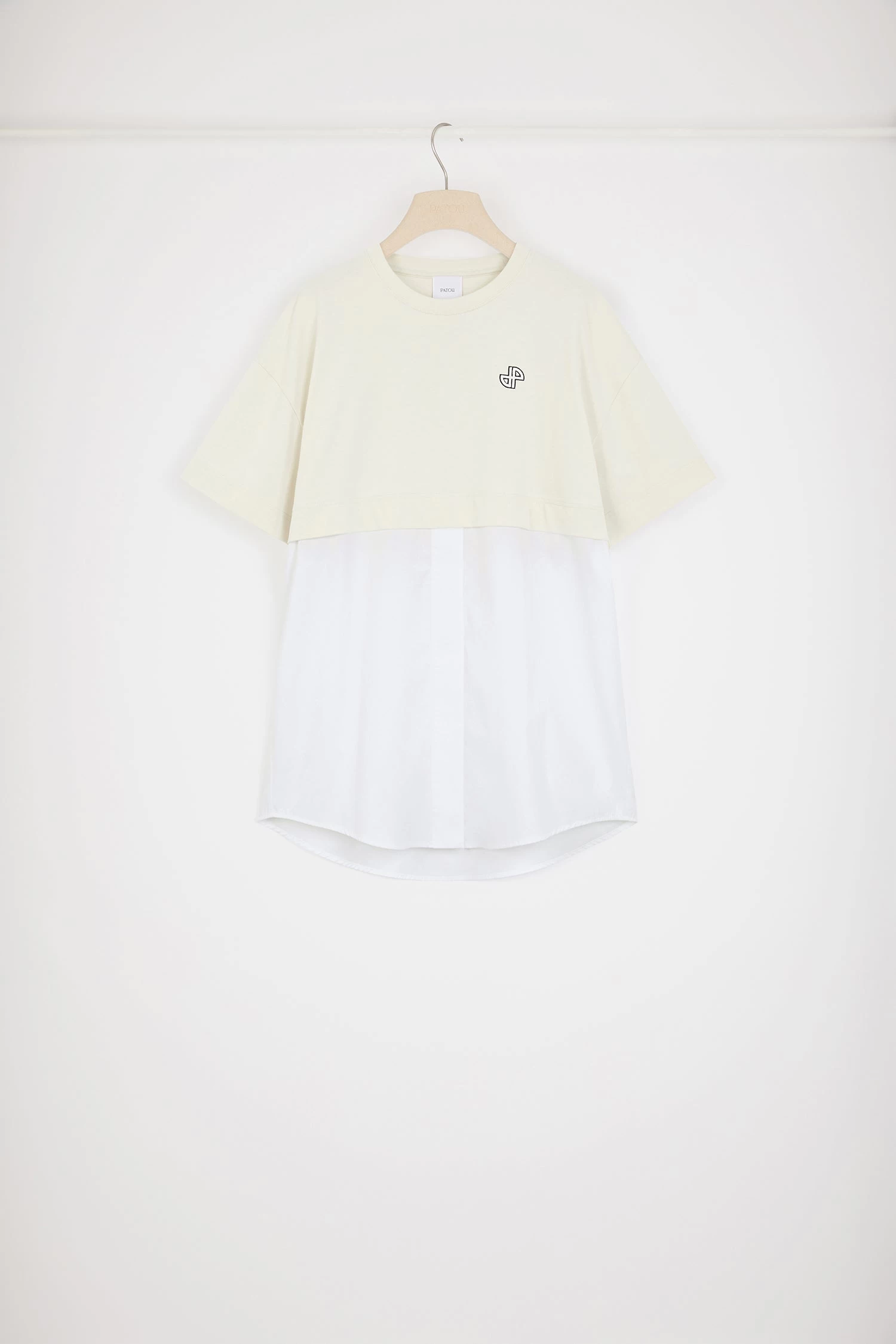Natural white organic cotton dress. Mixed fabric style with poplin bottom attached to a cropped tee. Short length. Crewneck. Embroidered JP at the chest. Concealed summary fastening.