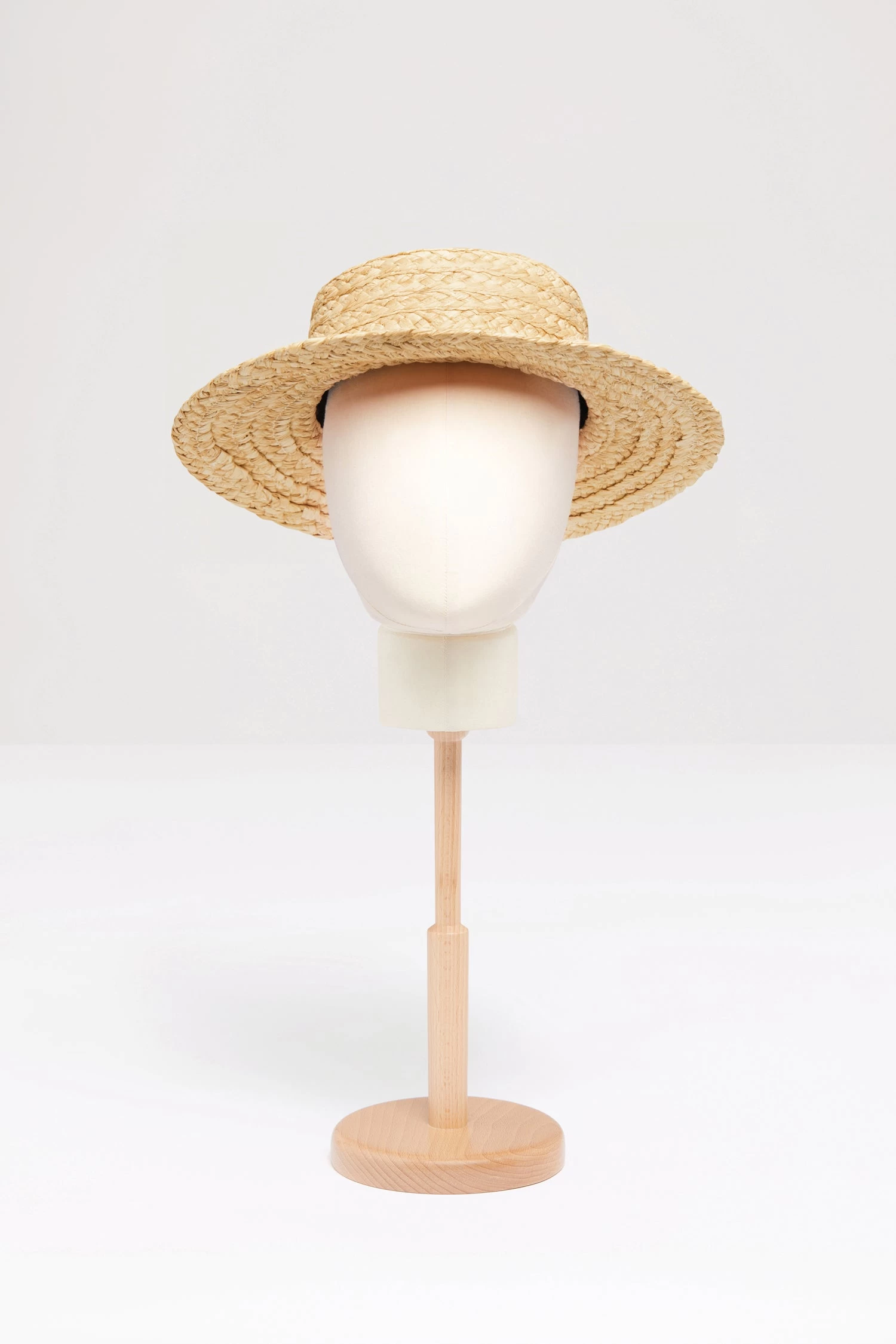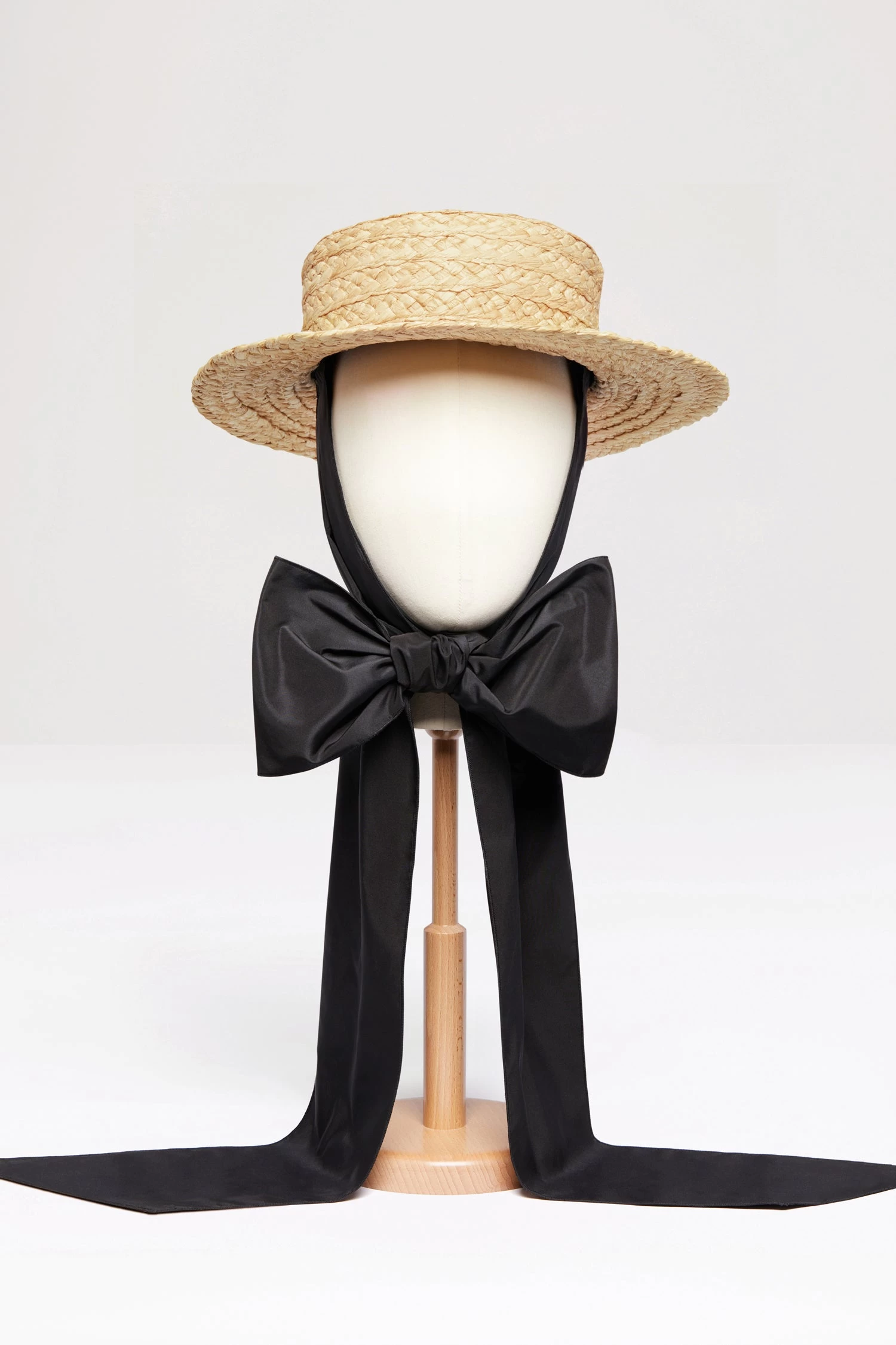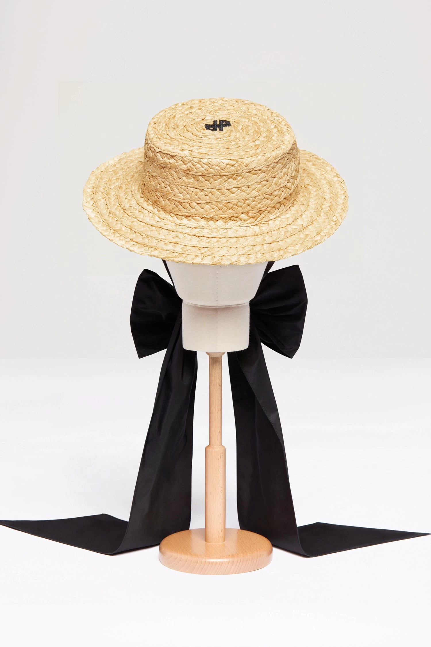 Vanilla natural raffia hat. JP monogram in black at the top. Removable maxi faille bow in black that can be tied at the chin or worn loose.