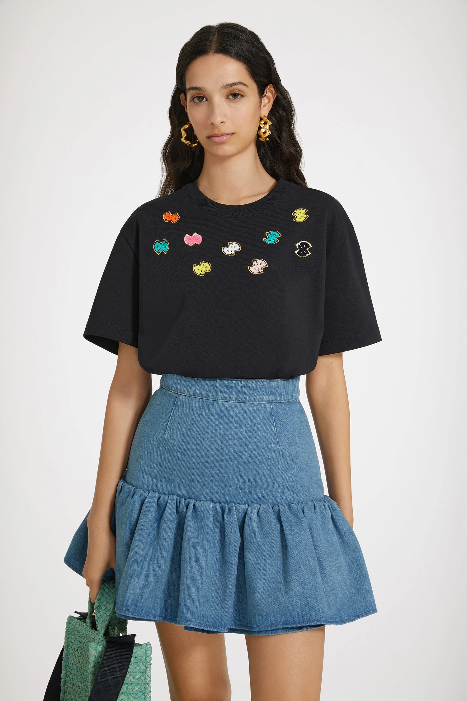Black organic cotton t-shirt. Regular fit. Crewneck. Multicoloured JP bouclette appliqués across the neck.