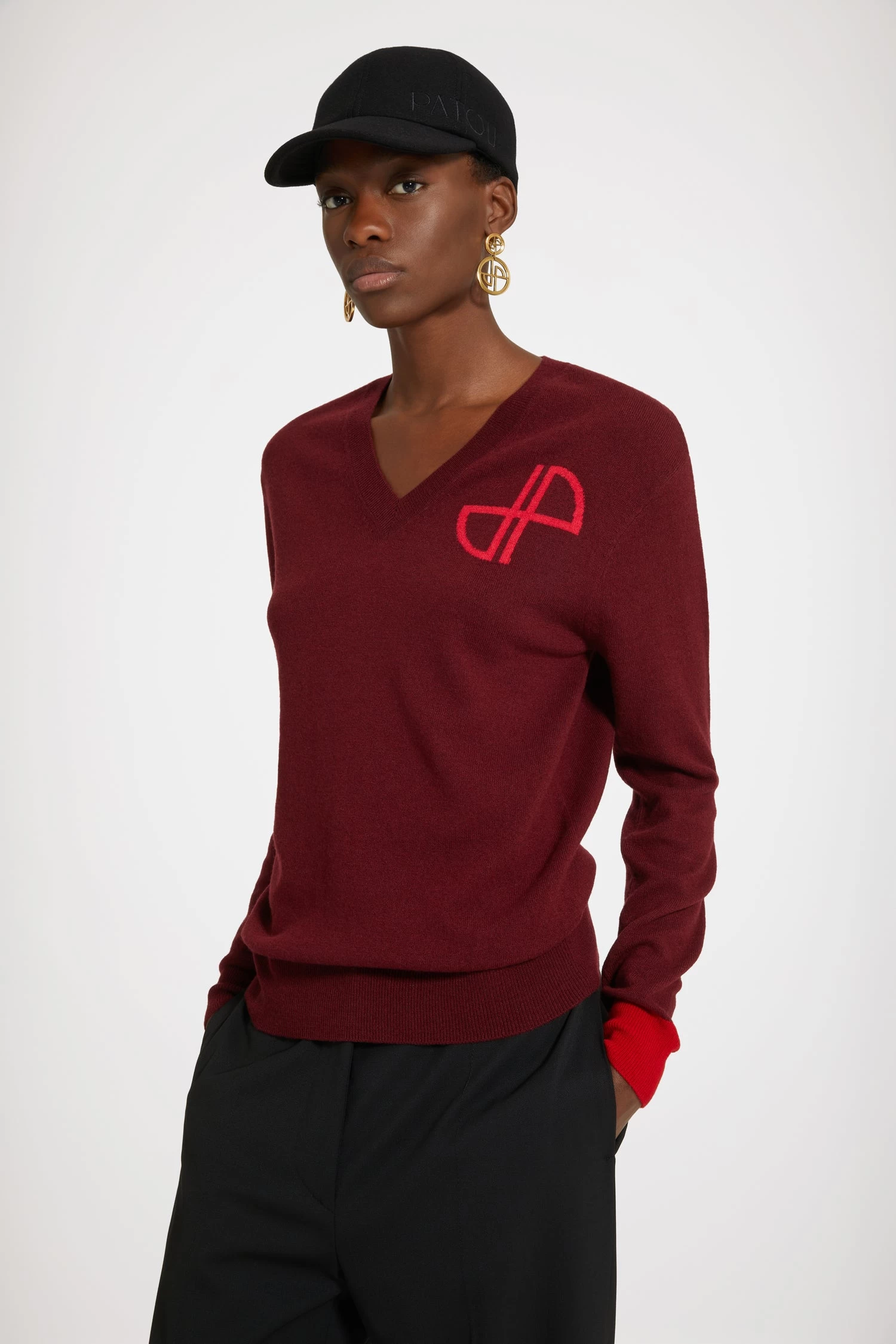 Dahlia burgundy wool and cashmere jumper. Relaxed silhouette. V neckline. JP monogram at the chest. Single contrast cuff.