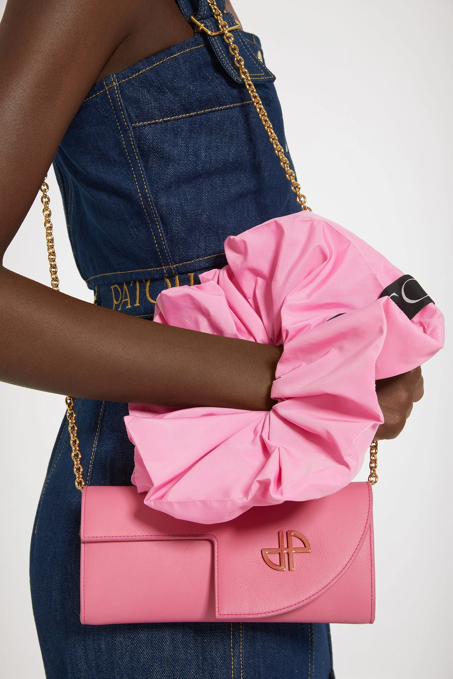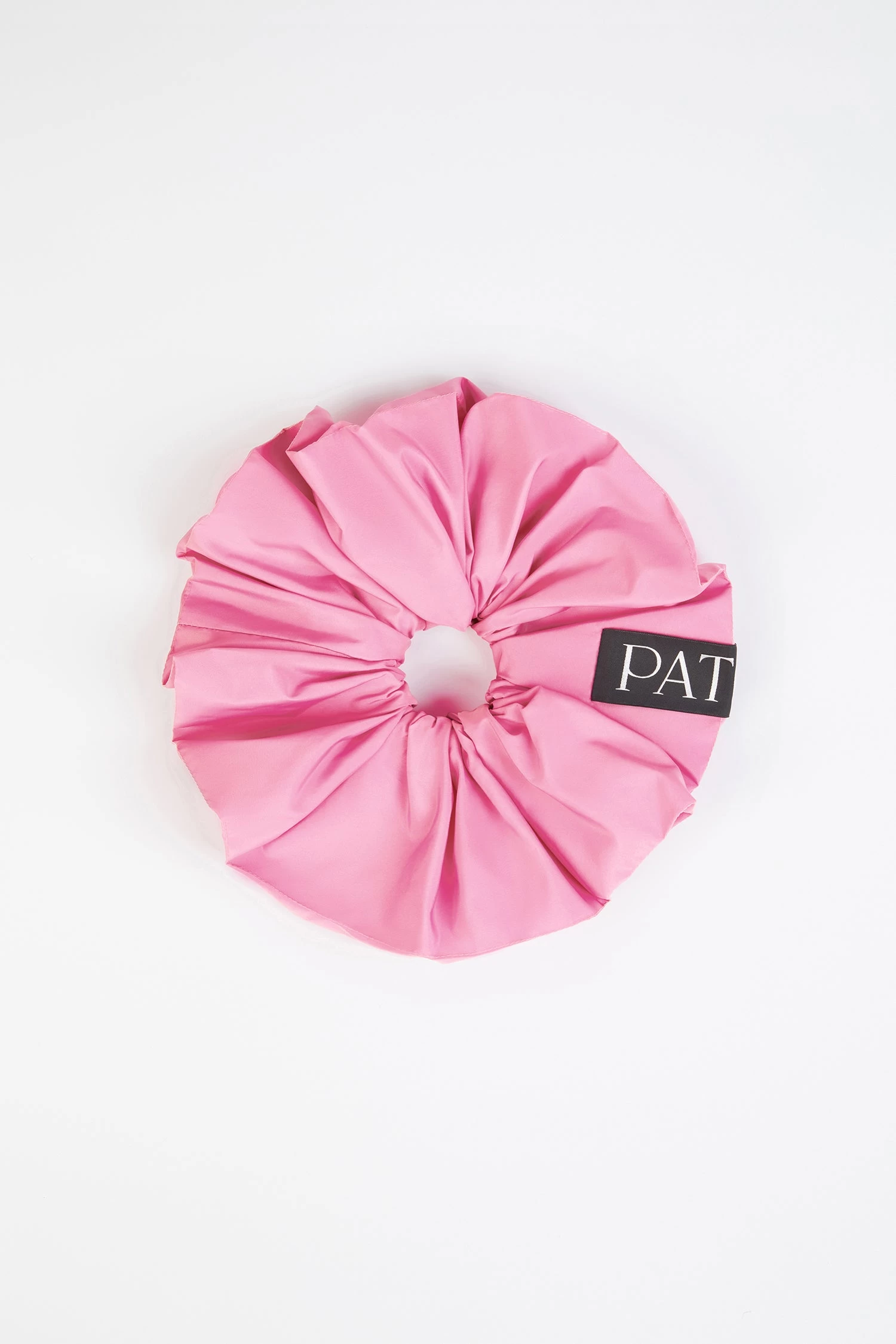 Pink recycled polyester faille scrunchie. Oversized style. Patou label.