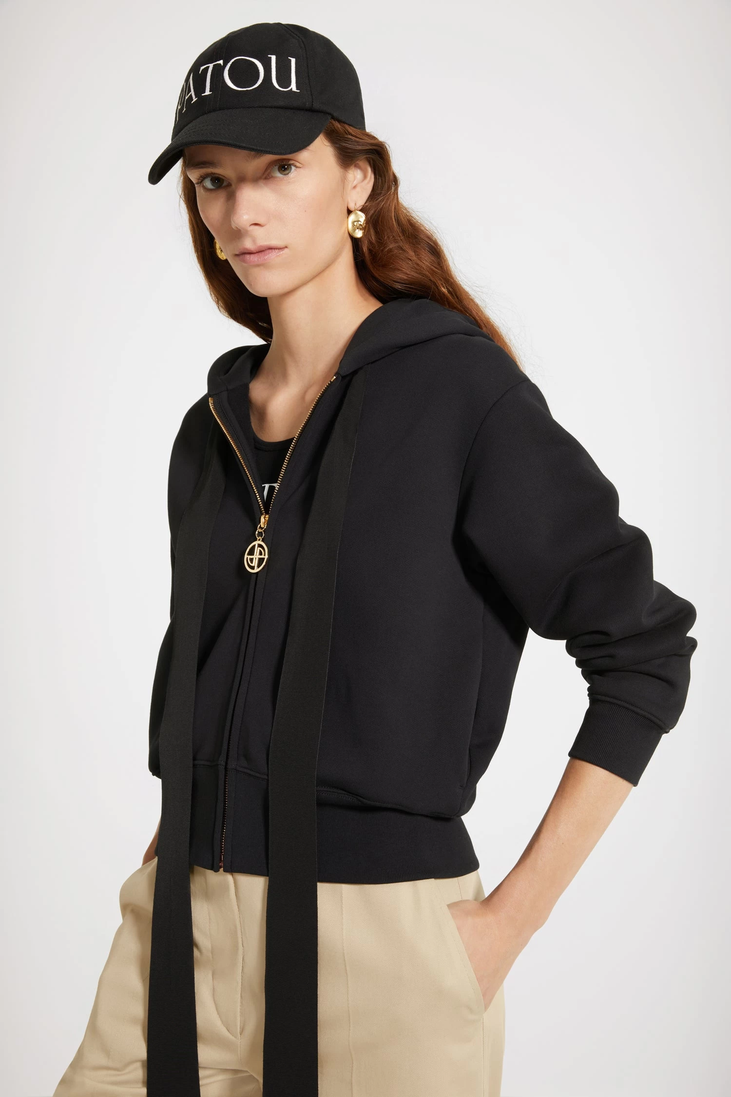 Black organic cotton zip up hoodie. Exaggerated grosgrain ties designed to hang loose at the front. Gold-coloured zip with stylised logo pull tab. Lettering logo in white at the back. Ribbed cuffs and waistband.