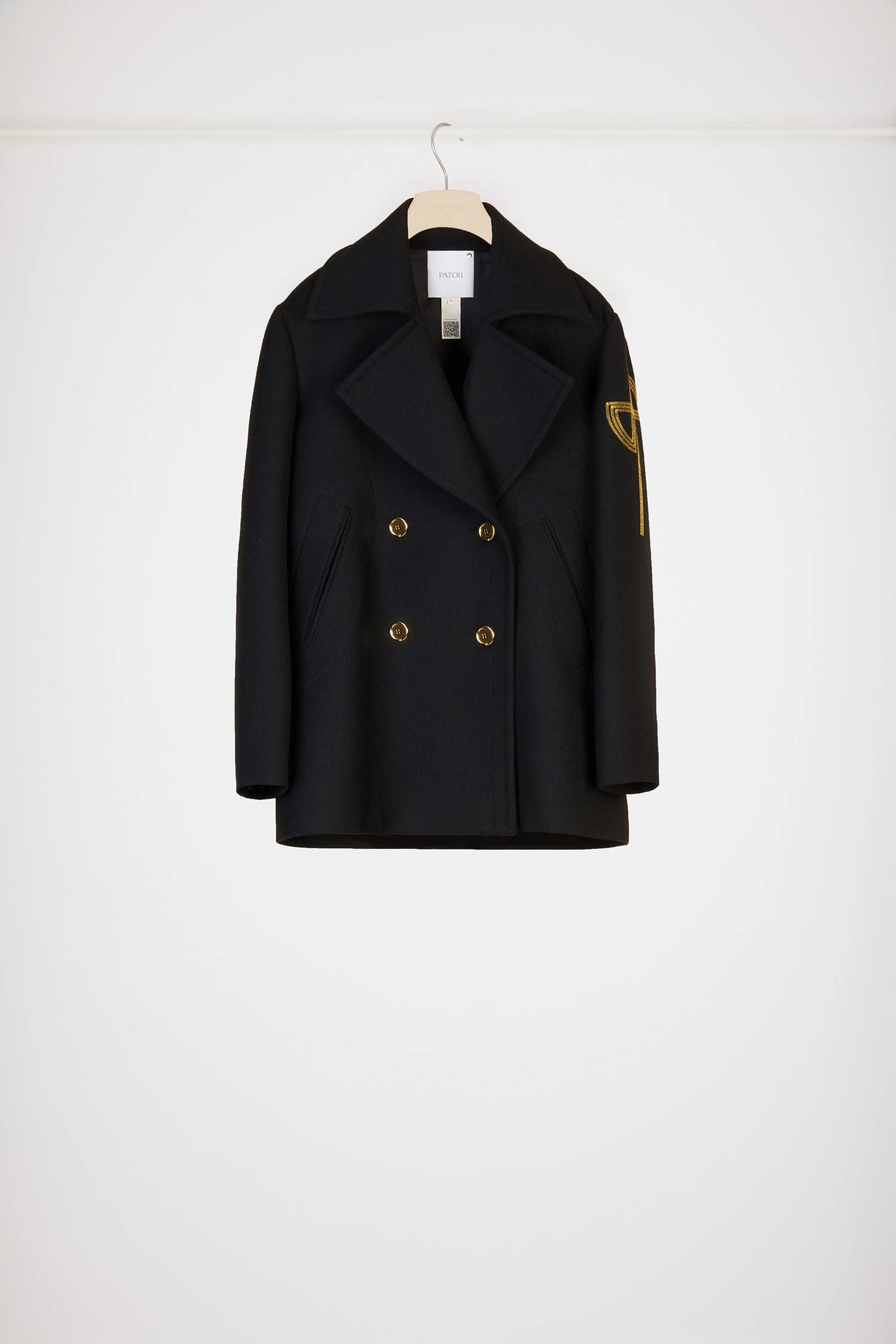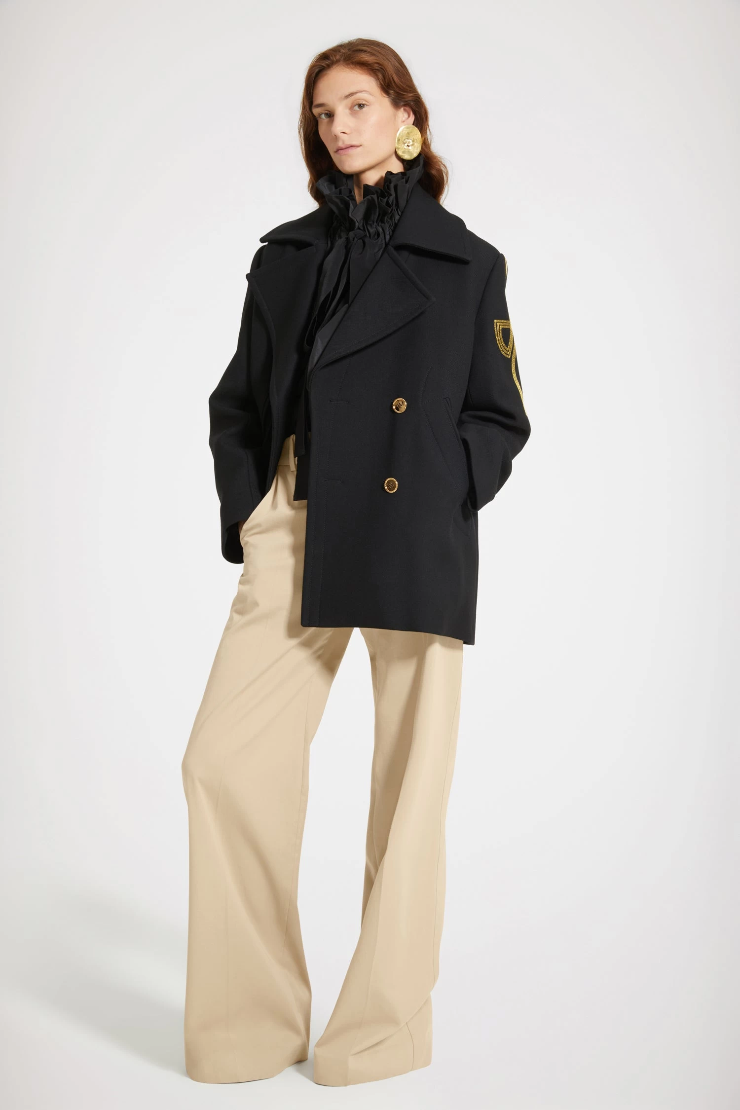 Black virgin wool peacoat. Double-breasted style with exaggerated lapels. Engraved gold-coloured summarys and gold embroidered logo on the sleeve. Slit pockets at the sides. Fully lined.