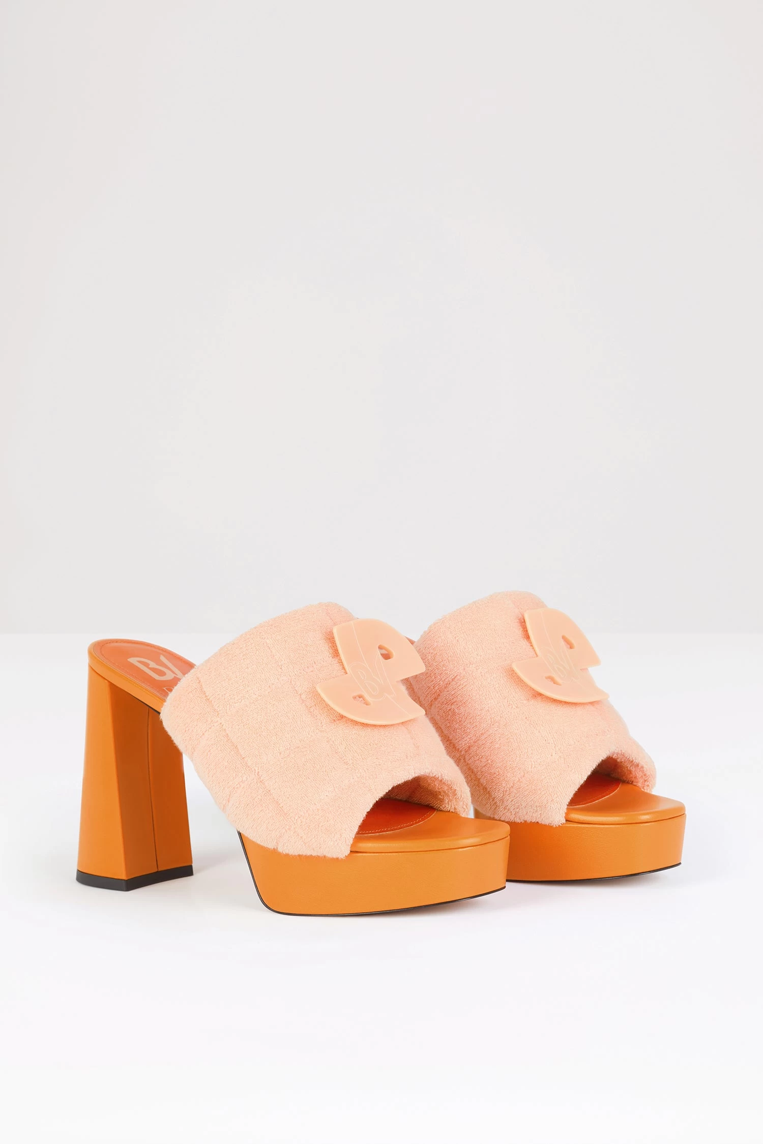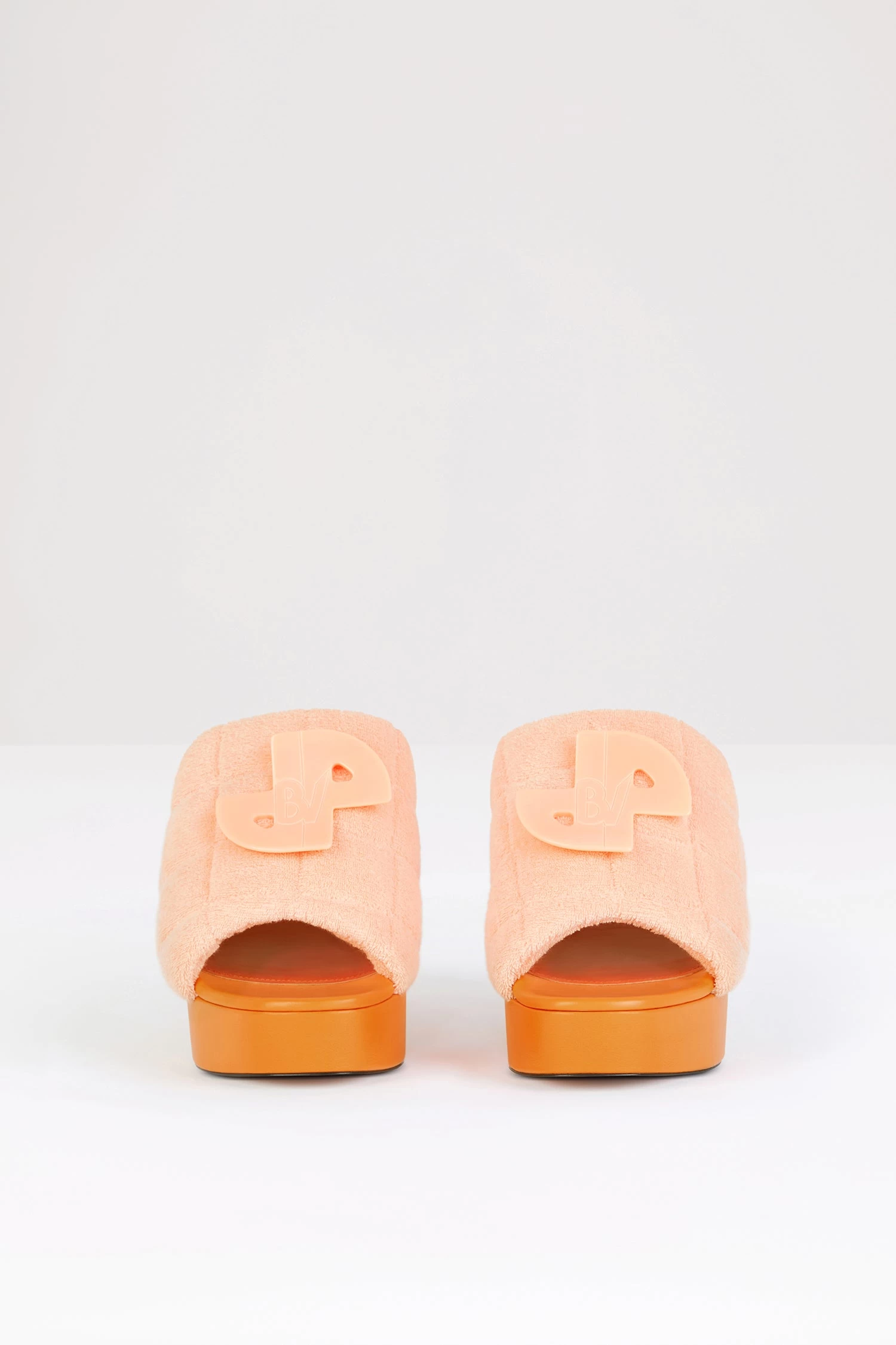 Peach orange cotton terry mules. From a special collaboration with Paris-based shoemaker Bettina Vermillon. Wave quilted upper with JPBV appliqué. 11 cm block heel.