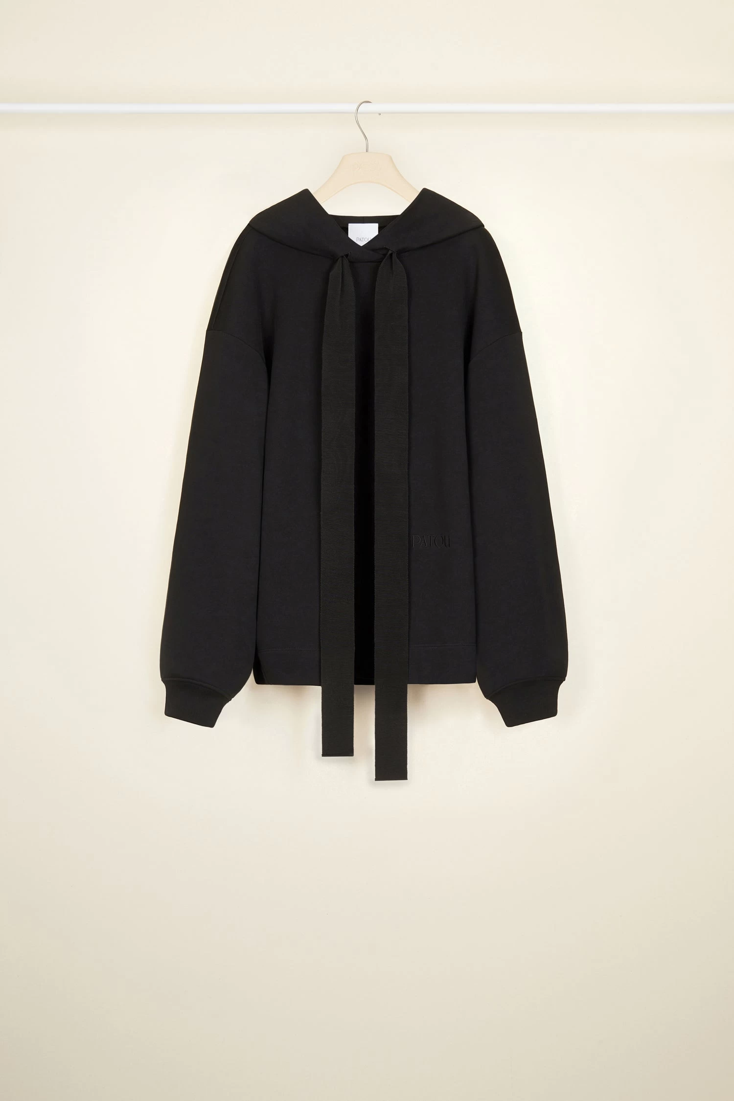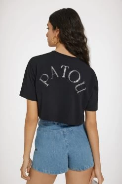 Black organic cotton hoodie. Unisex style. Hooded collar with grosgrain drawstring. Dropped embossed shoulders. Patou lettering logo embroidered at the front. Patou lettering logo printed in white across the back. Ribbed cuffs.