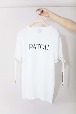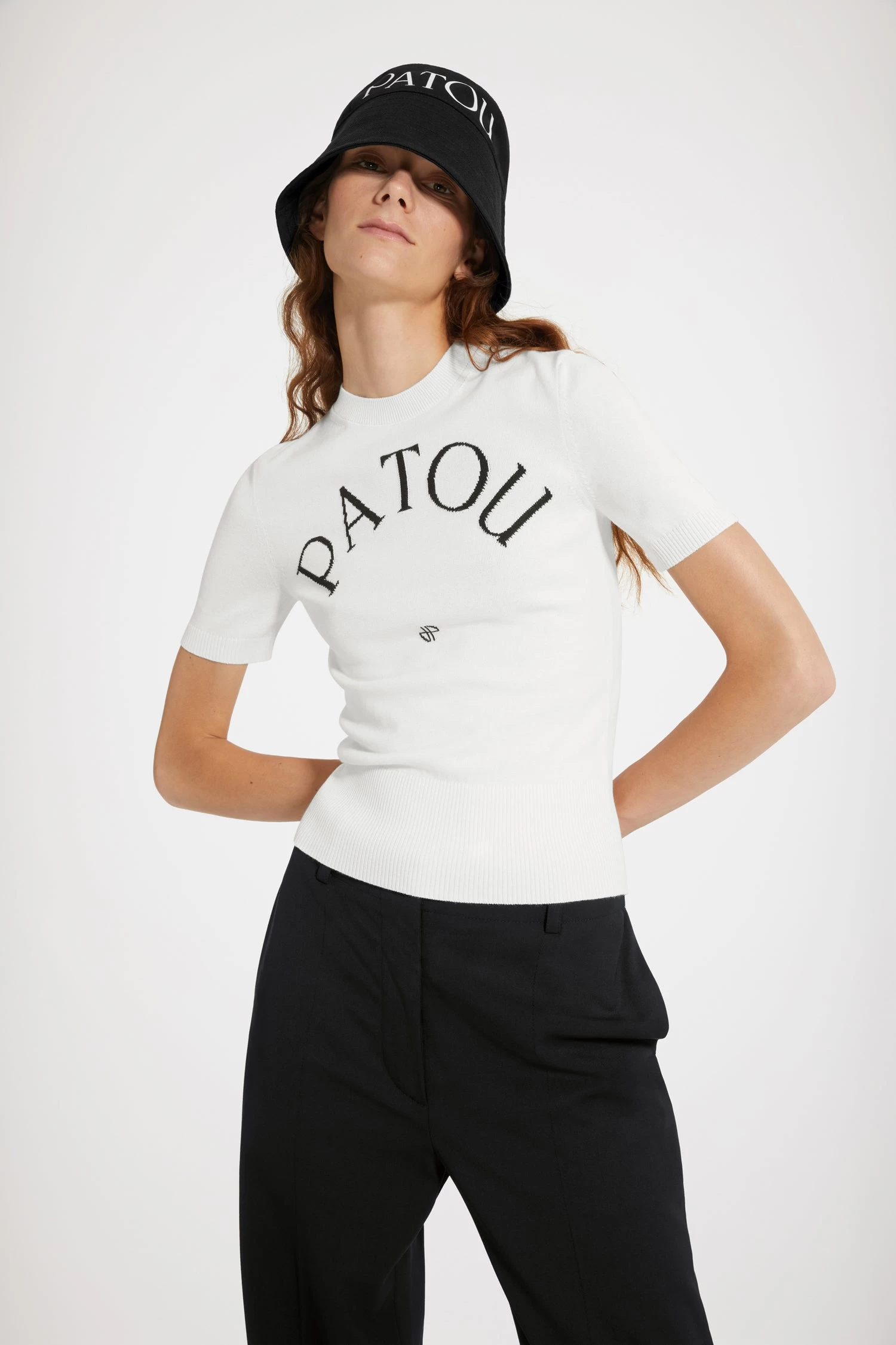 White organic cotton blend knit top. Fitted style with short sleeves. Round neckline. Ribbed collar, cuffs and waist. Patou lettering logo and monogram jacquard in black at the front.