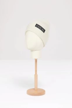 Blue Merino wool beanie. Part of the Patou Neige collection. Hand knitted style. Large black pompom. Fold-over cuff with contrasting white trim.