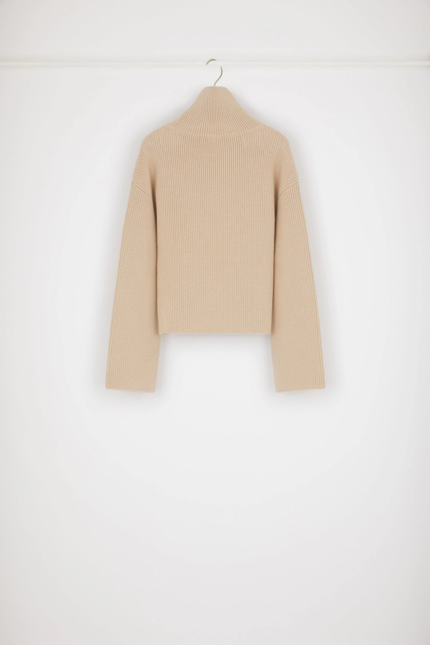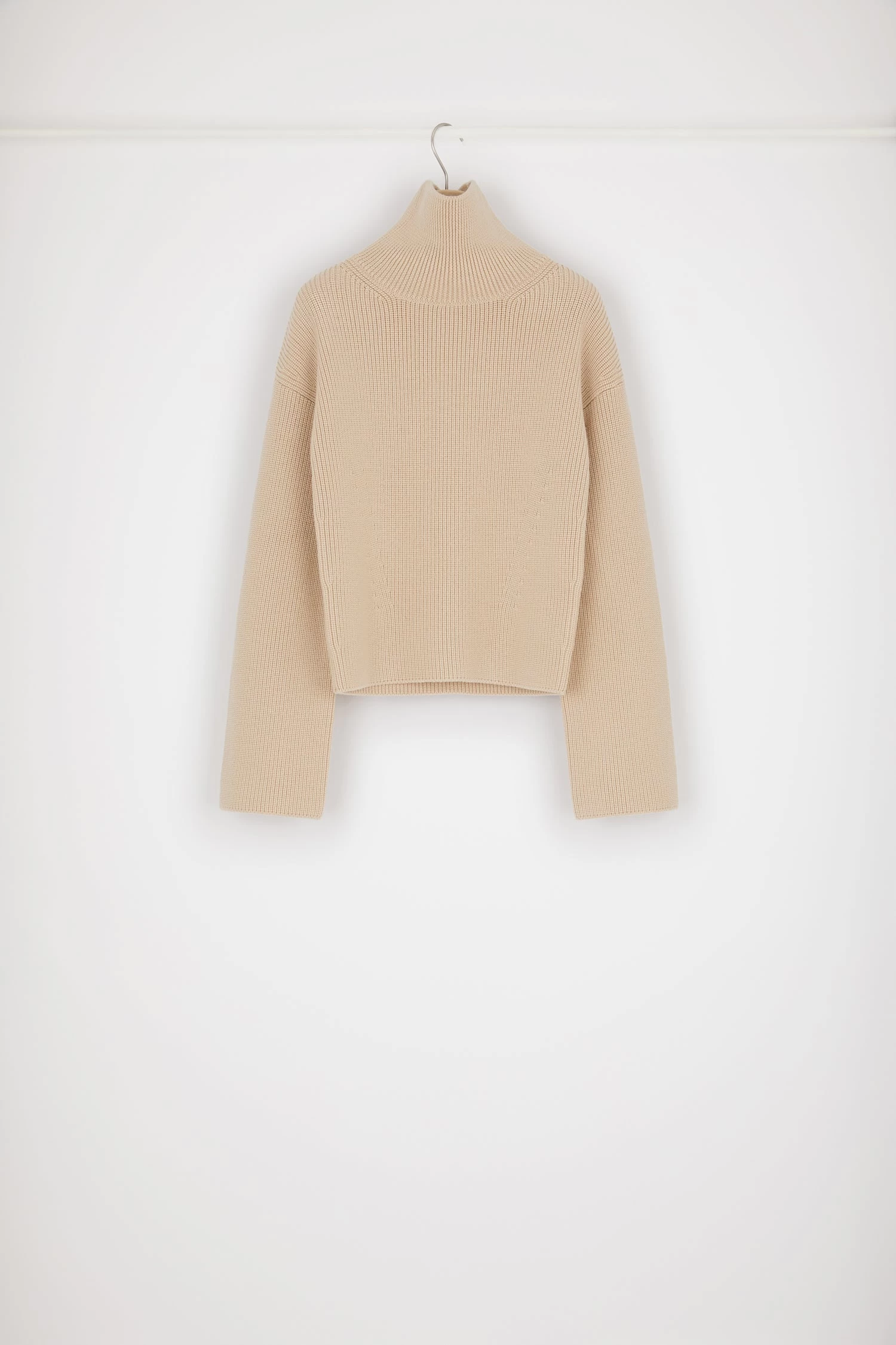 Biscuit beige Merino wool jumper. Rib knit. High turtleneck collar. Decrease detail on the shoulders. Slightly flared sleeves.