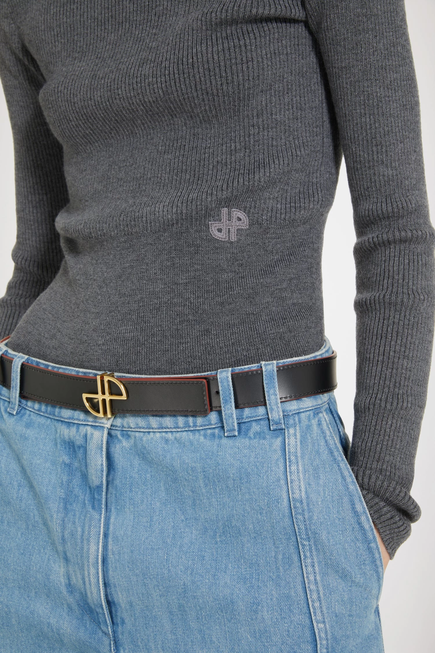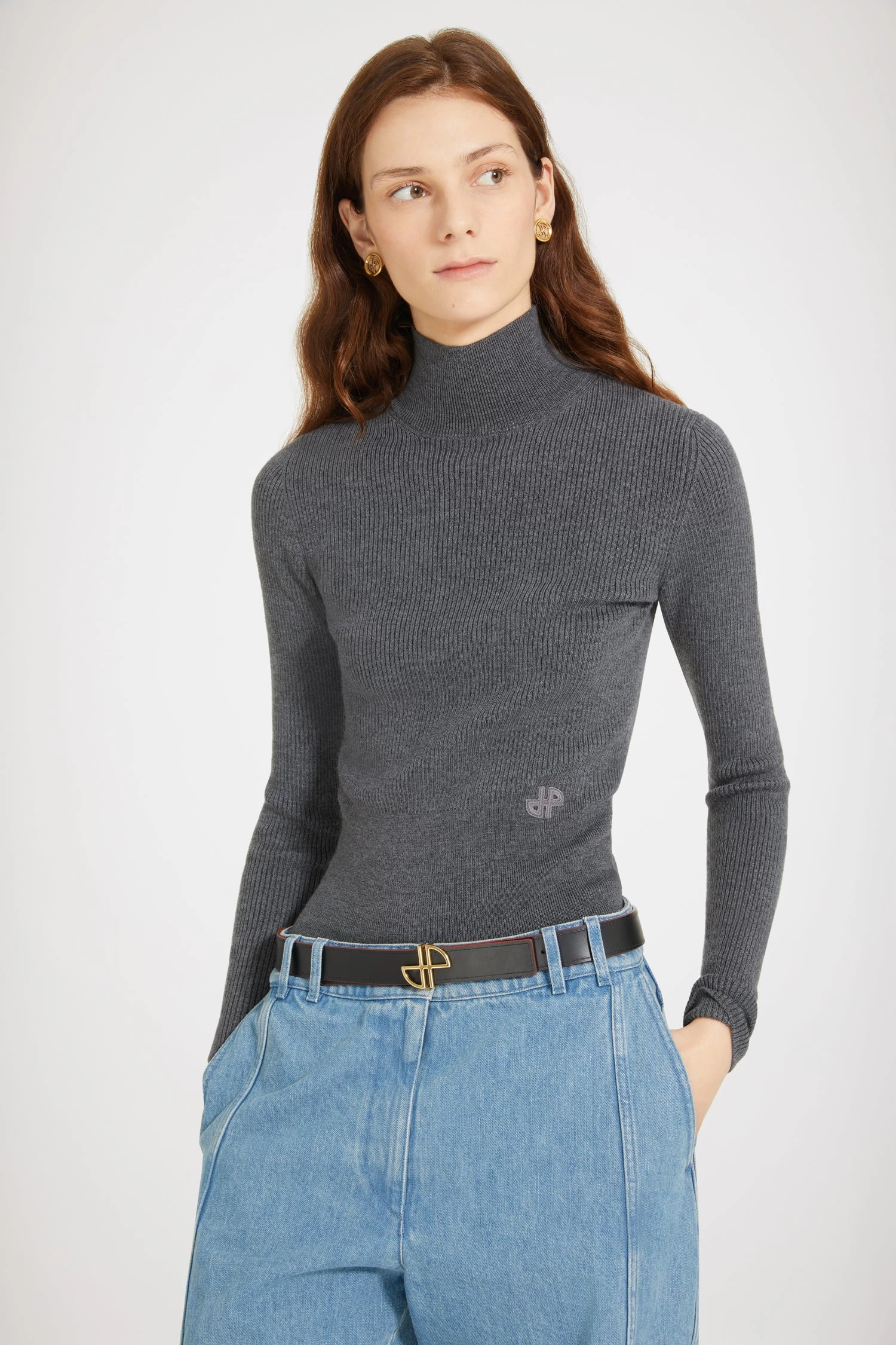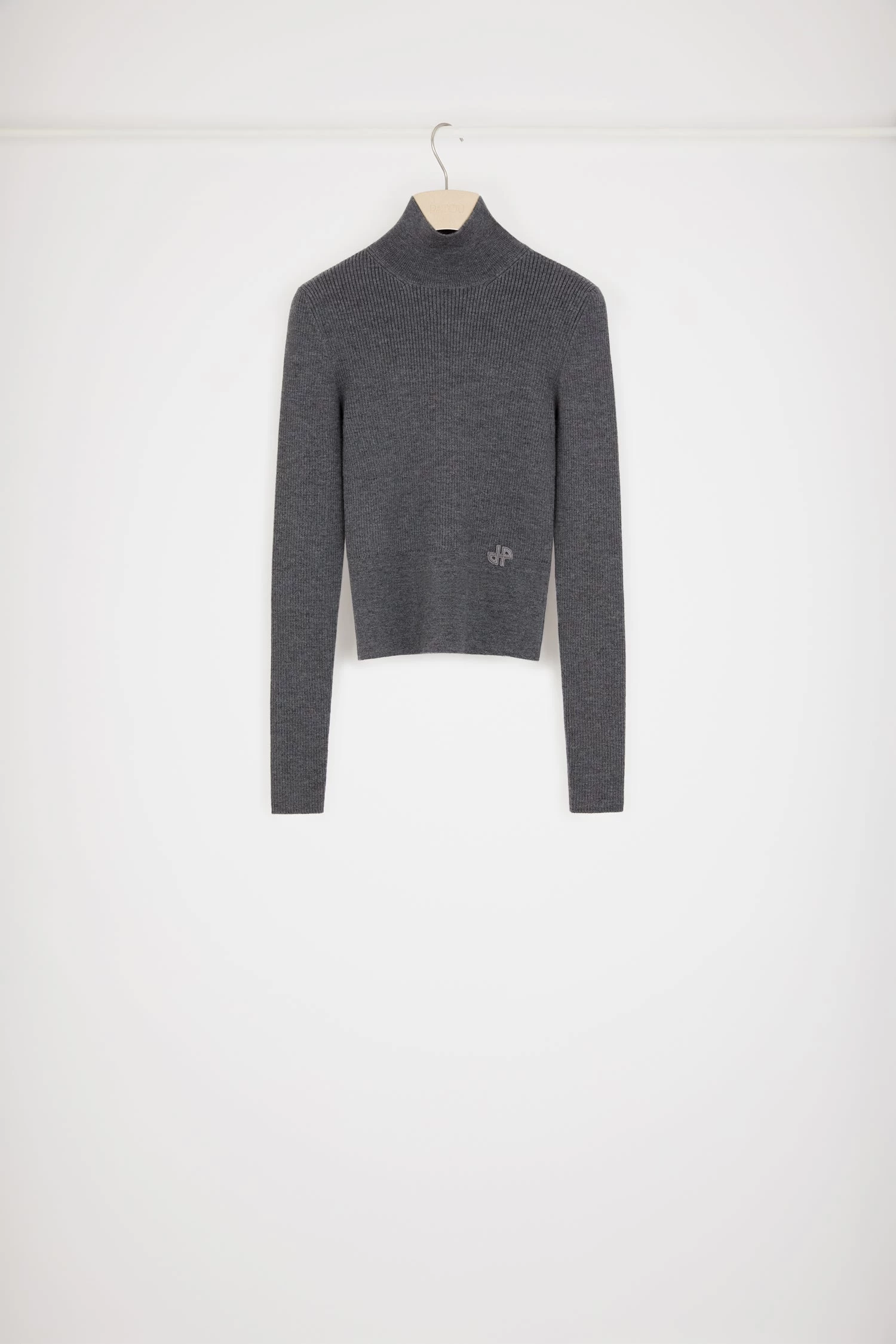 Graphite grey wool blend jumper. Rib knit. Fitted style with a high neck. Embroidered JP at the front.
