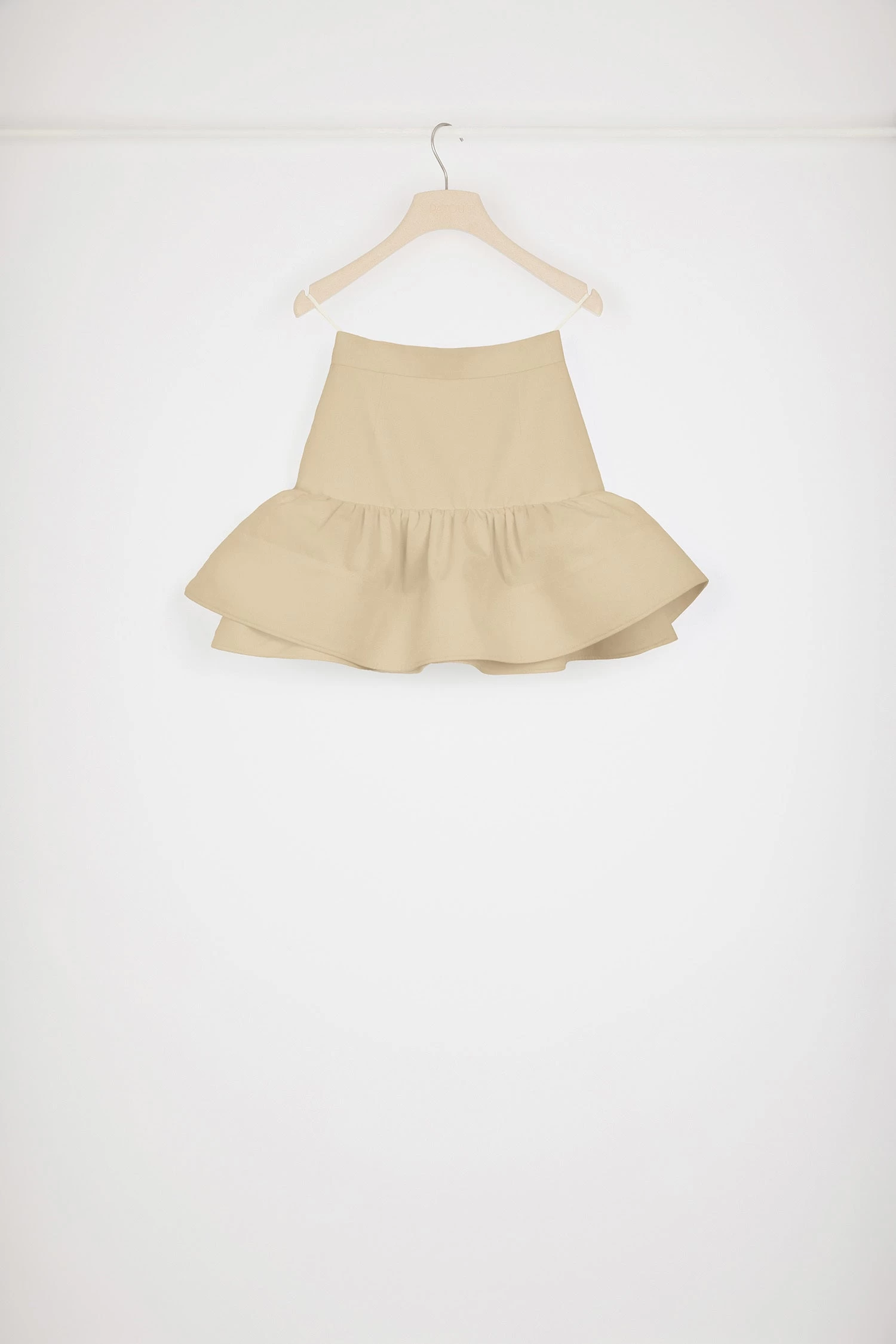 Beige cotton gabardine skirt. High waist. Short length. Fit and flare silhouette with maxi ruffle at the hem. Zip fastening at the back. Darts at the front and back.