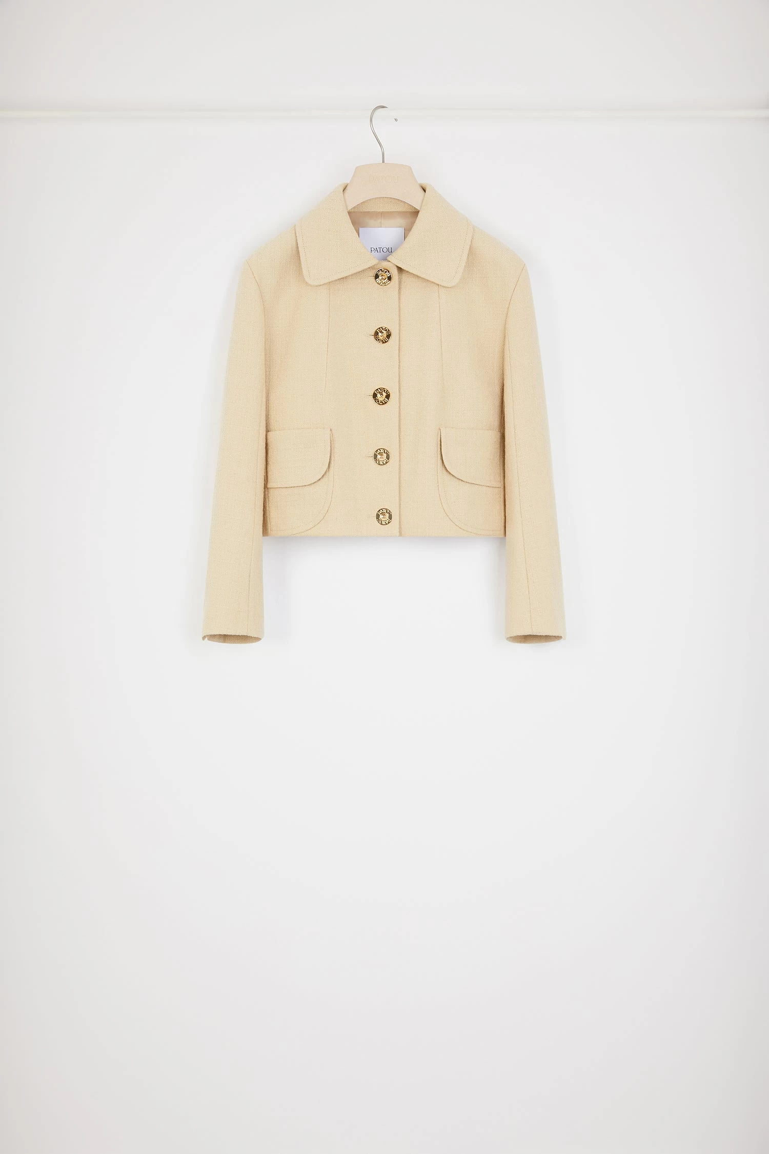 Beige cotton tweed jacket. Cropped length. Wide collar. Gold-tone Patou-engraved summarys. Patch pockets. Patou label on the left sleeve. Split cuffs. Lined.