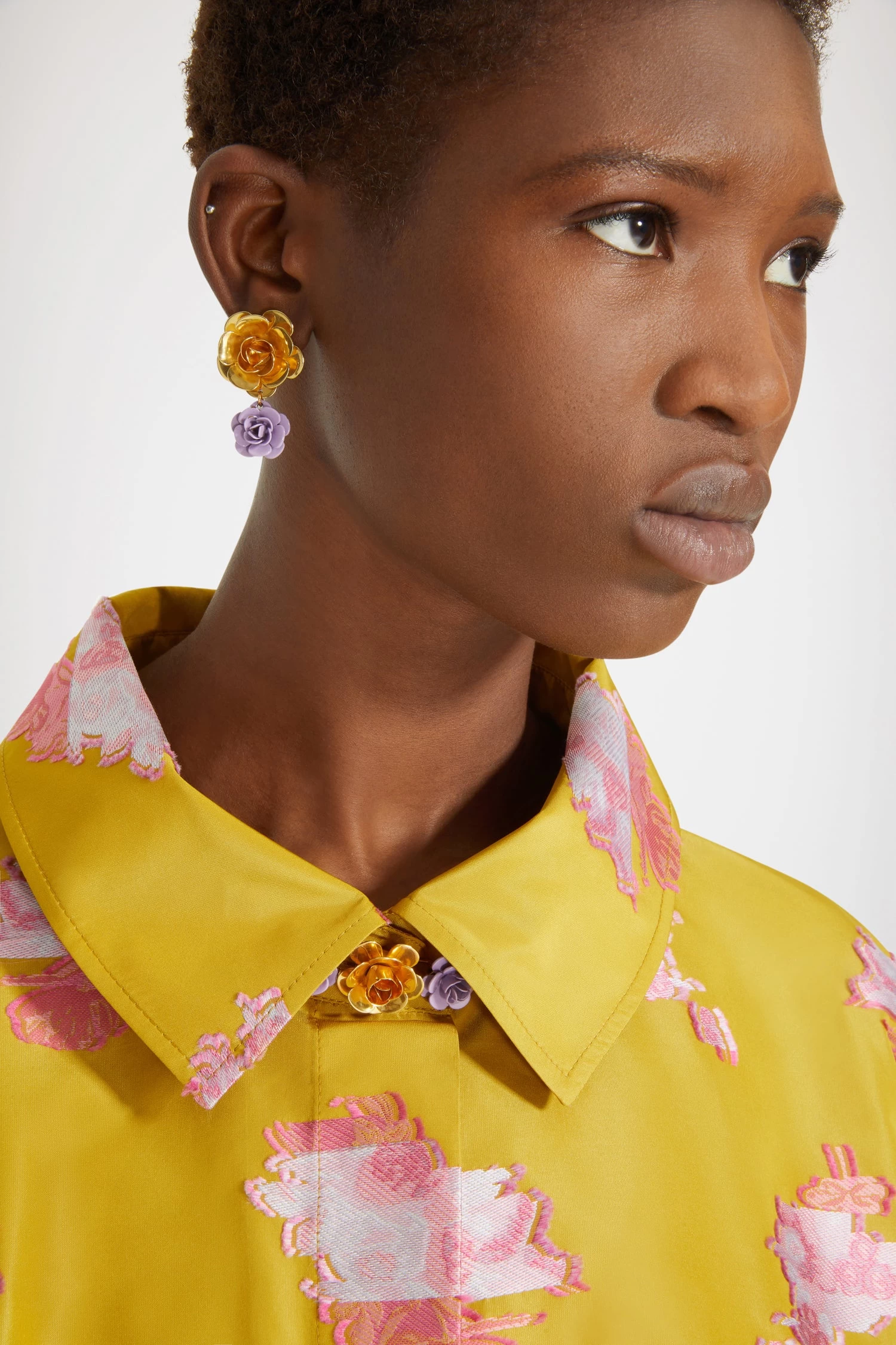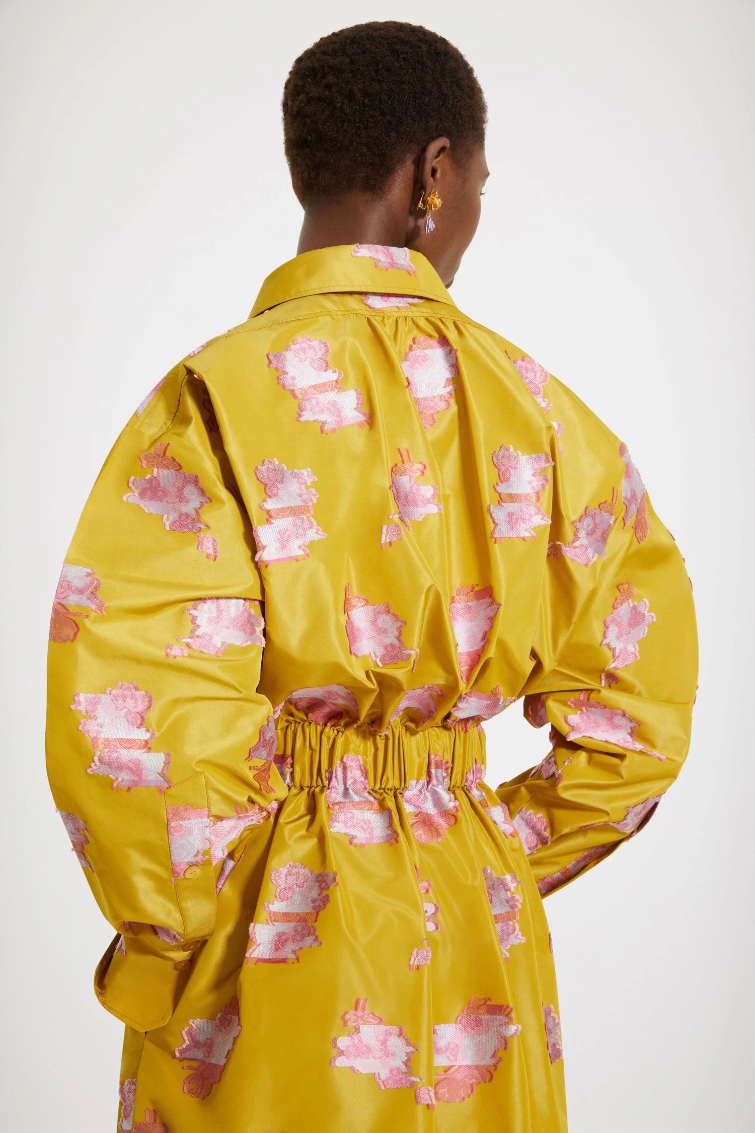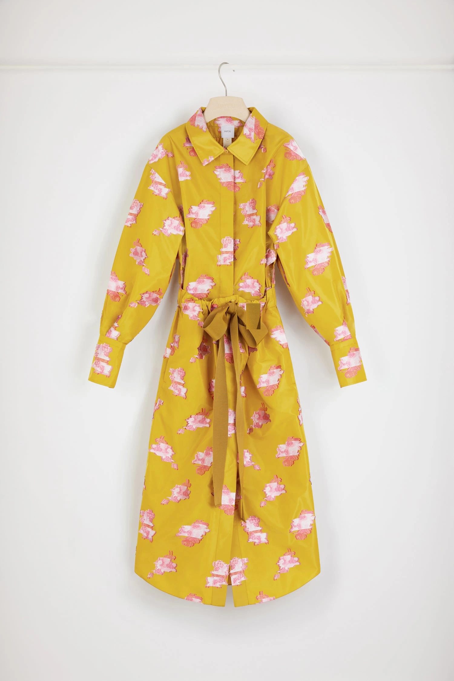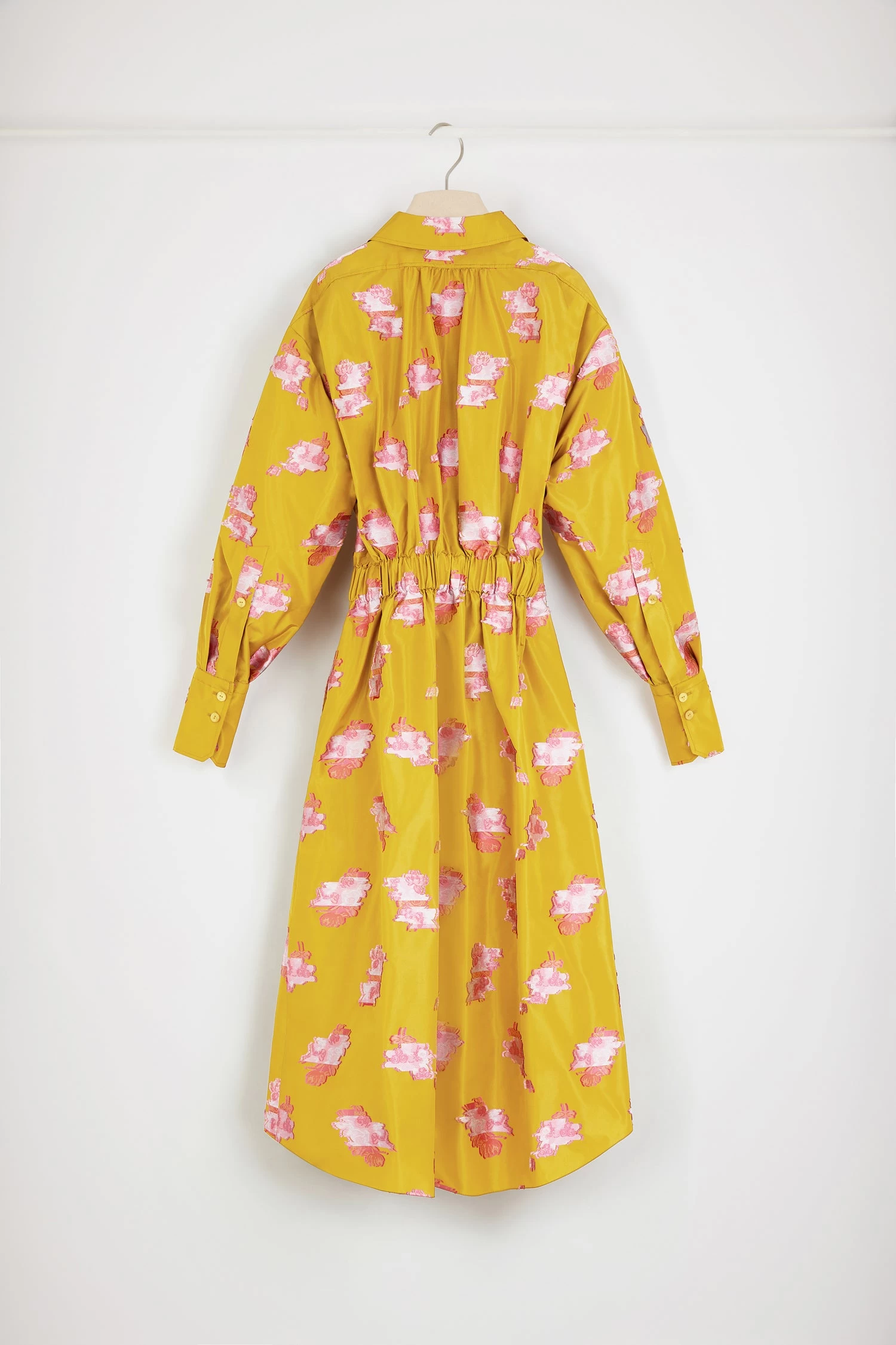 Gold Absinthe polyester faille cotton dress. Contrasting floral appliqués all over. Maxi length. Full silhouette. Trompe-l’oeil design with shirt at the top and summaryed skirt at the bottom; attached at the back. Concealed summary fastening. Volume sleeves with summaryed cuffs. Drawstring waist with self-tie grosgrain belt at the front. Pockets at the sides.